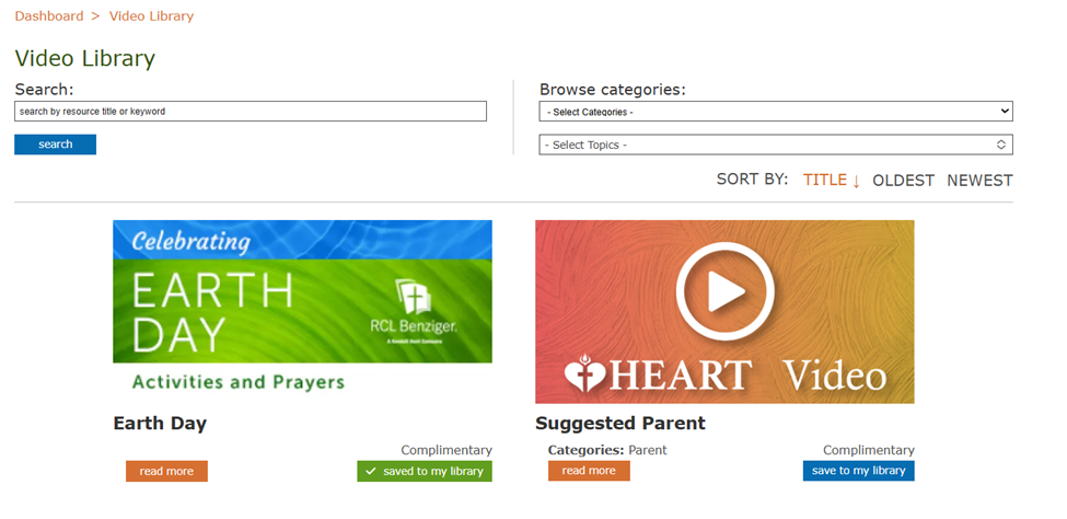 5)Video Library is set up the same as Resource Library. Searching and adding will be the same as on the Resource Library page.