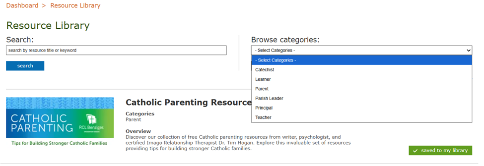 3)To add the resource to your My Resource Library simply click “save to my library” or “add to cart” to purchase it. Once either option is completed it should then give a green box with a check mark stating, “saved to my library”.