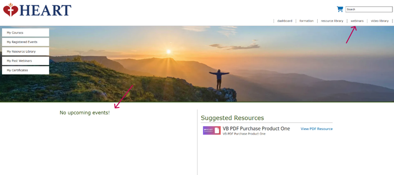 There are 2 locations that you can go to register for Events/Webinars. You can see the Upcoming Events on the Dashboard page or you can click on “webinars” to access the full list of all upcoming events/webinars scheduled.