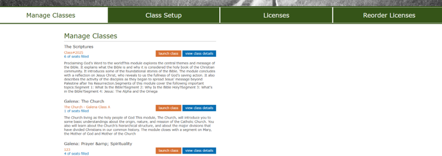 Once a class has been created, a Diocese Admin can then go to the Manage Classes tab. Here the Admin can find the class they would like to make changes to. Once they have found the class they can click on “view class details” to make changes to the class. This will open “Manage Class Details”