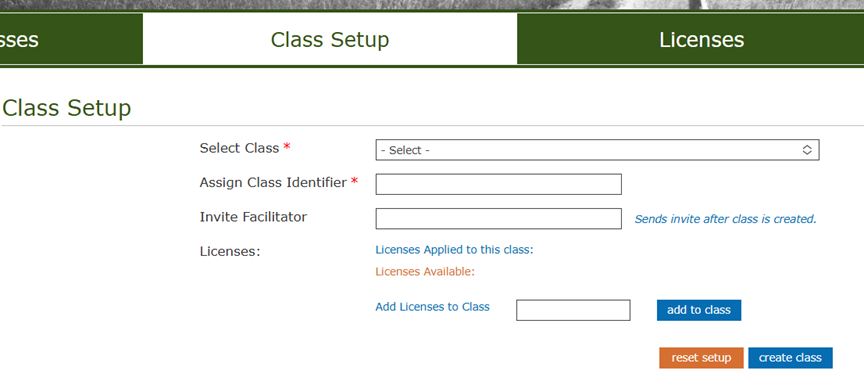 The next tab is Class Setup. Here you can create new classes and invite your initial Facilitator(Teacher).