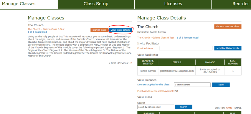 Admins can also Change the number of licenses used for the class in the Manage Class Details. This will also show how many licenses are available.
