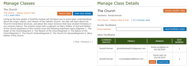 With “Manage Class Details” active, Admins can send out invites for Facilitators(Teachers). Classes can have more than one Facilitator. Admins will be able to see who the Facilitators for the class are, when the invite was set/when the invite was accepted. An Admin will also be able to either cancel the in invite or resend it if the Facilitator hasn’t accepted it yet.