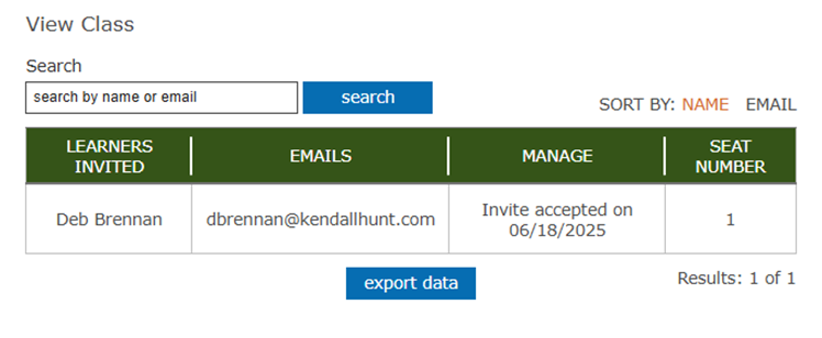 Admins can see the Learners(Students) in the class but are not able to send invites to Learners. There is a search bar Admins can use depending on how big the class is. The Export data button will make an Excel file list of all students in the class.