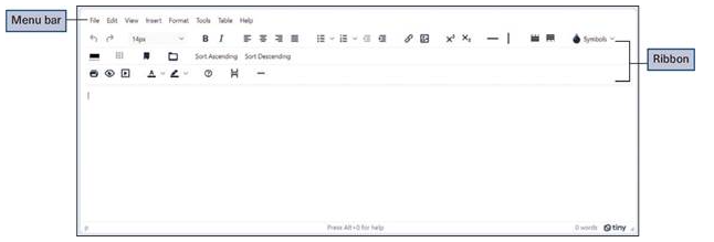 When you open a document in the document formatter, a blank document displays (Figure 34.1). Figure 34.1 also shows some of the commonly used features in the document formatter interface. The document formatter interface features a ribbon that contains several menus and buttons. Each menu on the Menu bar provides a different set of formatting commands and buttons. The ribbon is indicated in Figure 34.1.