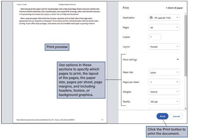 The Print window will display a preview of how the document will print, and the print settings buttons at the right of the image are used to make changes to how the document will print. Before clicking the Print button to print the document, use the drop-down list in the Destination section to select a printer. Use the Pages option to determine which pages to print and use the Layout option to change the orientation of the document before printing. Click the More settings option arrow to display options for changing paper size; determining how many pages of the document to print per sheet; changing the margins and scale of the document displayed on the page; and determining whether to include headers, footers, and background graphics when printing the document.